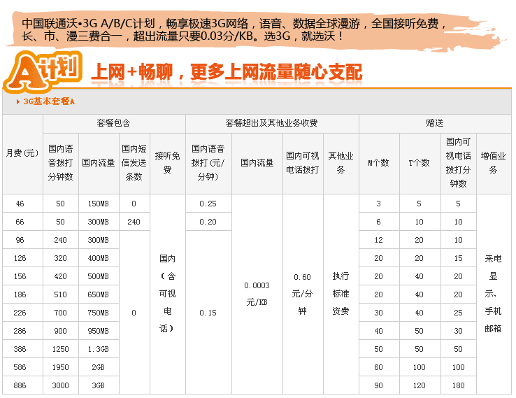 China Unicom offers two 3G data options on their SIM cards assigned with area code +186: ‘3G value pack’ (3G 套餐) and ‘3G web surfing pass’ (3G 上网卡). 3G value pack targets smartphone users, and 3G web surfing pass is for tablets. You will find a detailed breakdown of their service offerings at www.10010.com. I took screenshots of their latest services plans (current as of October 2012) below. (I will provide an English translation of those two images at a future revision of this guide.)
